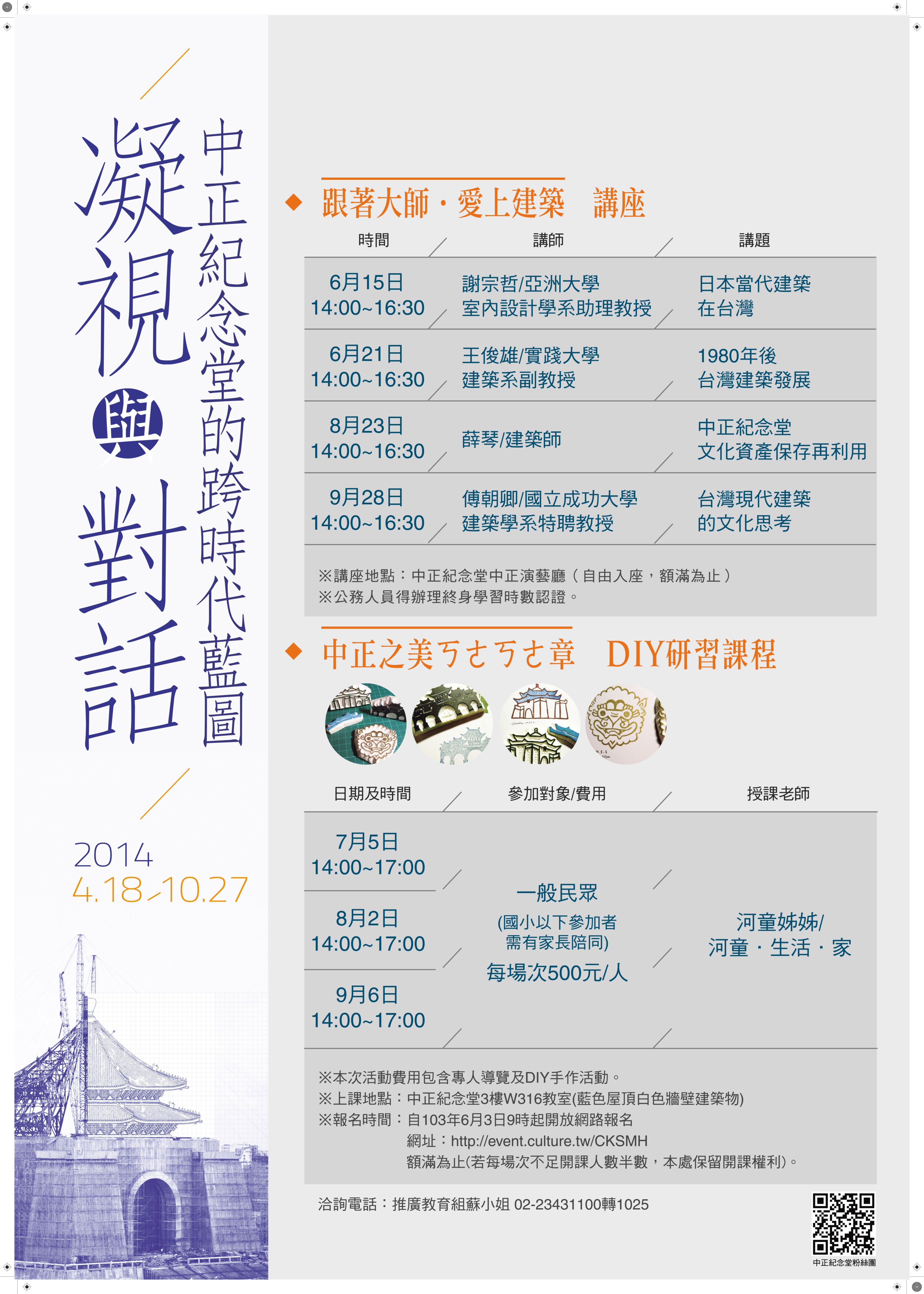 主旨:轉知國立中正紀念堂管理處「凝視與對話─中正紀念堂的跨時代藍圖」展覽之講座與DIY研習課程海報訊息供參,請 查照。
