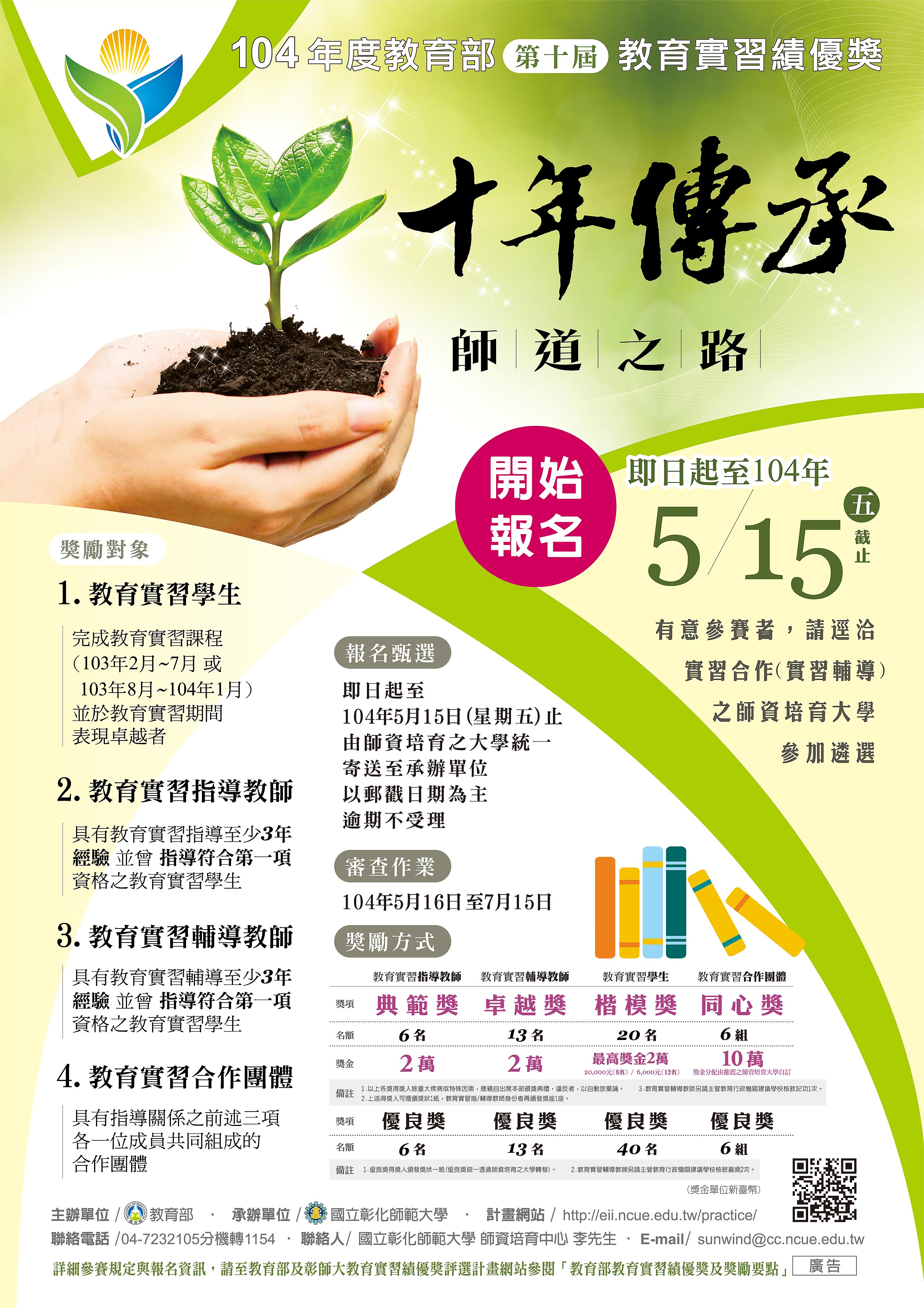 參賽相關資訊及表件,請逕至教育部教育實習績優獎網站(https://eii.ncue.edu.tw/Practice/)瀏覽及下載。